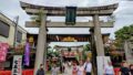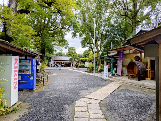 松尾大社に到着。駐車場から境内に入ります。右側にはお漬物屋さん。正面にはお蕎麦屋さんです。