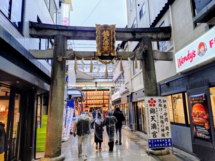 寺町京極商店街から錦天満宮へ向かいます。ビルに食い込んでいる鳥居です。