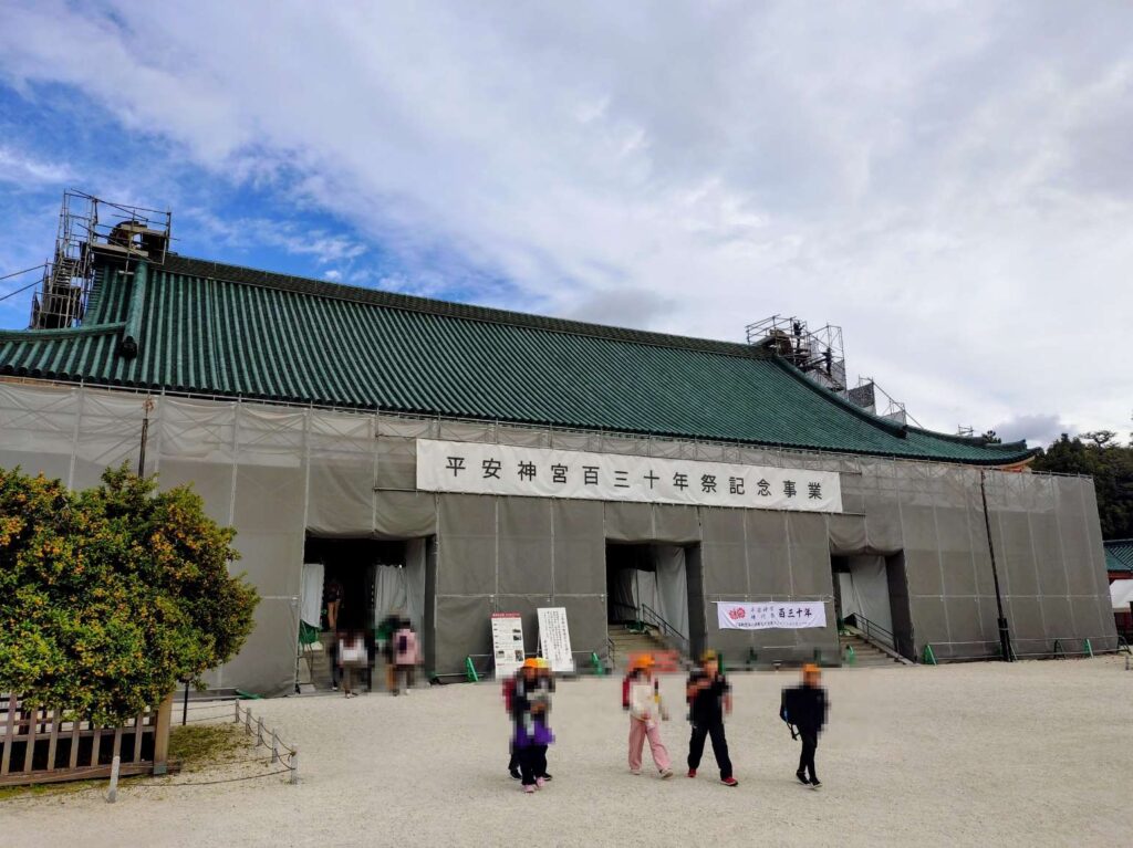 工事中の大極殿(外拝殿)の中へ。ちょうど七五三の祈祷の最中でした。心地よい太鼓の音が響きました。