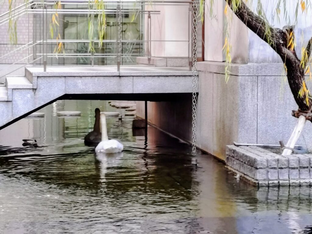 裏手の池で白鳥を見ようと思ったのですが、ちょうど2羽の白鳥が奥に行ってしまいました。船の様に優雅に移動していました。