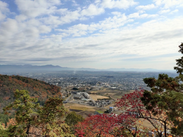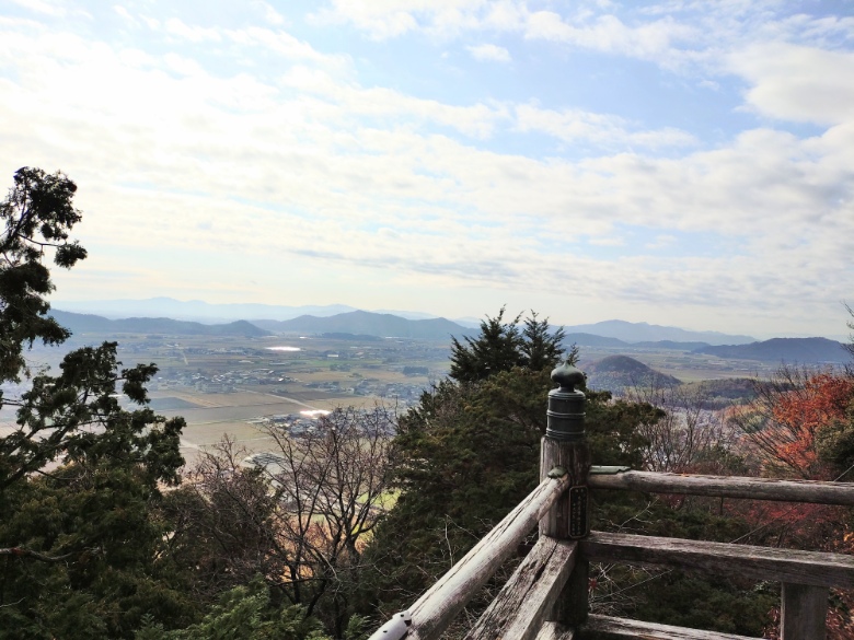 駅から10分も歩けば太郎坊宮が中腹に見えます。朱色の大きな建物は、社務所・授与所・参集殿です。実際にこちらの赤神山を見ると、天狗さんの姿を見ても不思議ではないような雰囲気があります。