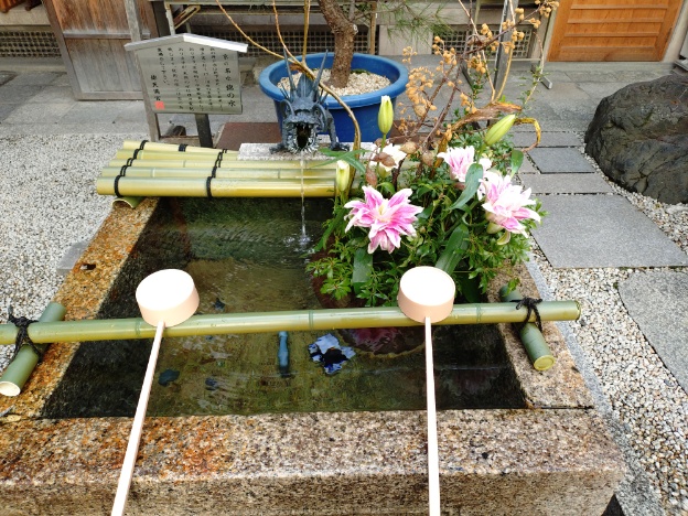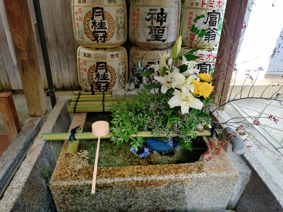 鳥居をすぎると左右に花手水。いつもキレイな花が飾られています。錦天満宮に来ると、花手水を眺めるだけでほっこりします。