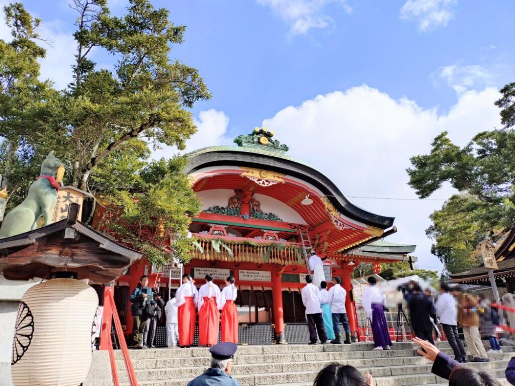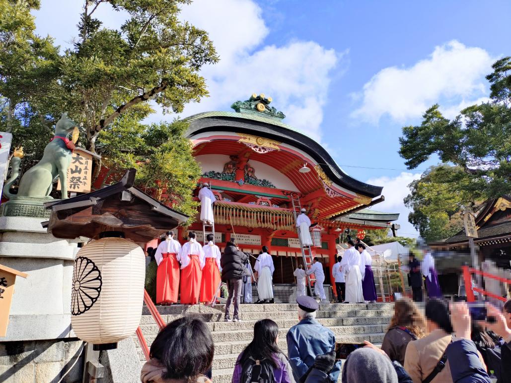 参拝しようと本殿まで来てみたら、神職さんが集まっています。新しい注連縄を取り付けているようです。