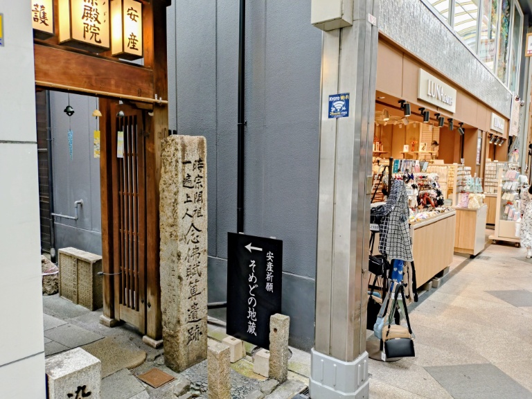この後は安産祈願の御利益があると評判の染殿院へ向かいます。四条通から新京極商店街に入ってすぐ左側です。