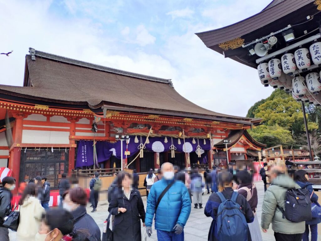 鈴の緒があると、それ程混んでいなくても参拝の列が出来てしまいます。個人的には八坂神社では鈴の緒はない方が早く参拝出来て良いですが、鈴の緒を鳴らしたい人も多いと思いますし。
