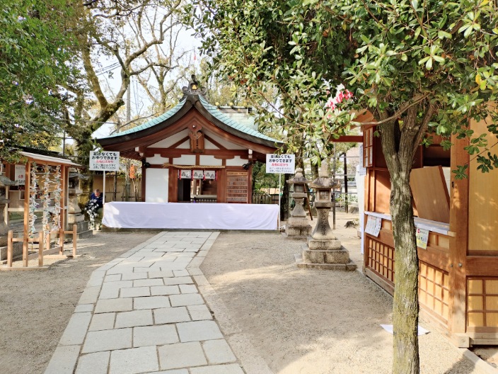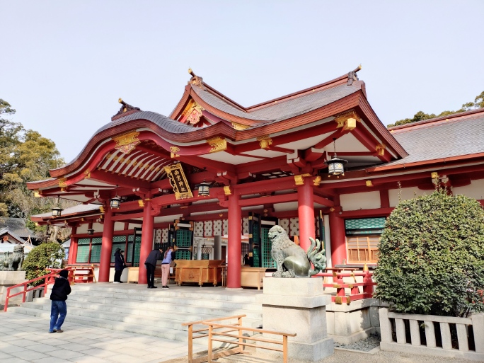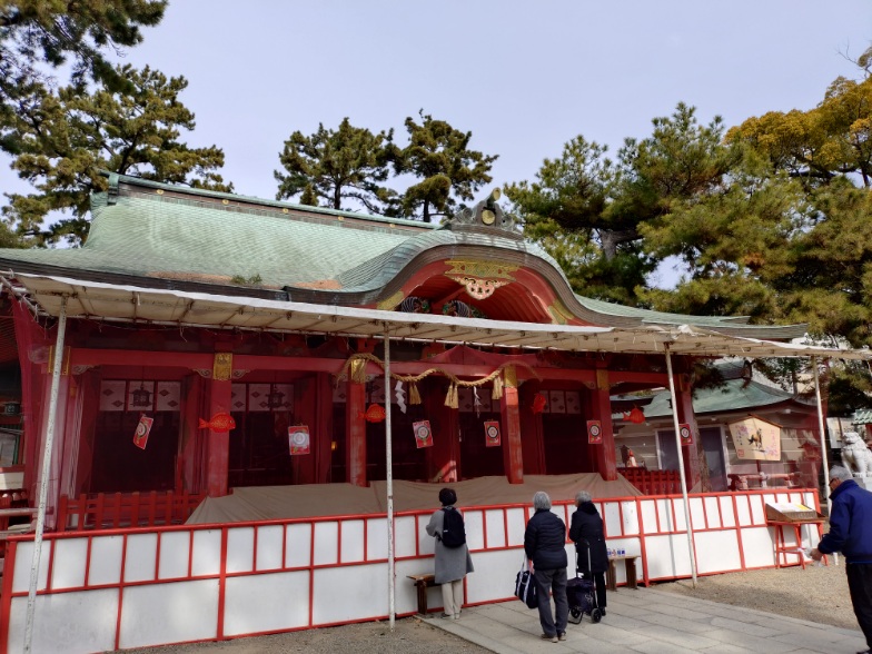 拝殿に到着。鮮やかで大好きな拝殿です。本殿の方を見てみると神事の最中の様です。心地よい祝詞を聴かせてもらいました。後で調べたら、十日戎報賽祭が行われていた様です。貴重な場面に立ち会えました。🙏