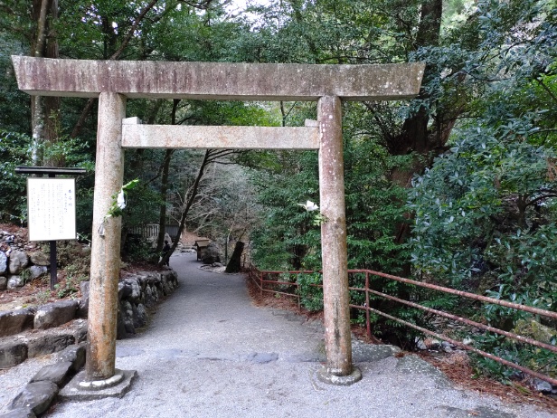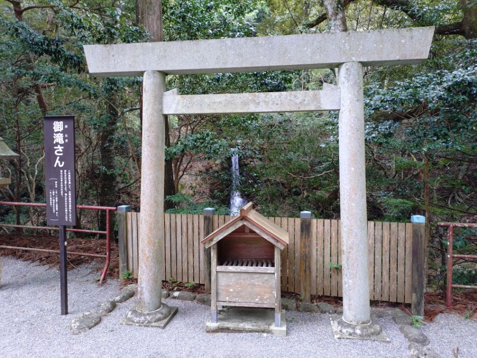 「御滝さん」。先ほどの滝を鳥居越しに参拝です。