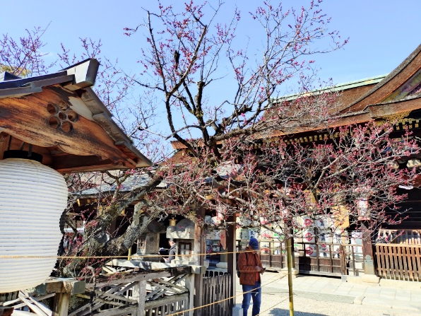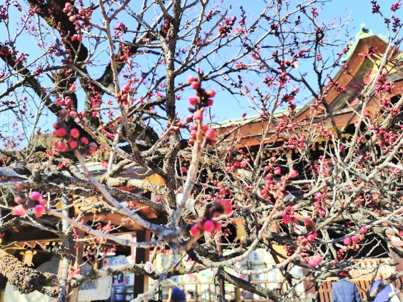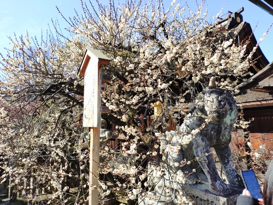 梅の季節なので平日ですが賑やかです。この参道の先には縁日ほどではないですが露店が並んでいます。