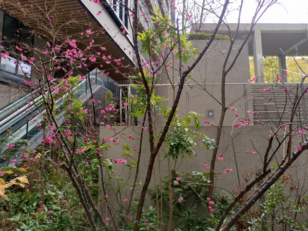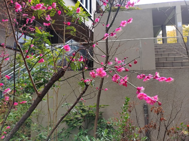 鮮やかな色の梅が咲いています。