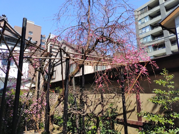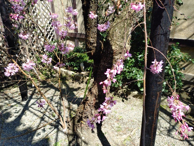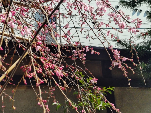 そのツバキのさらに奥には枝垂れ桜。2日前に来た時は、ほとんど咲いていませんでしたが、一気に開き始めました。