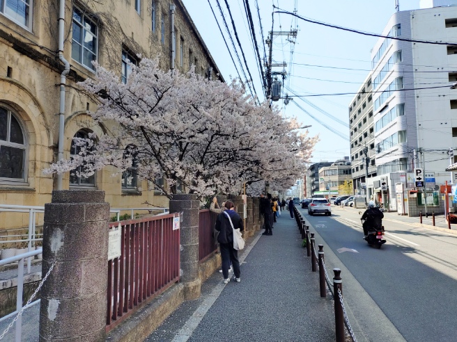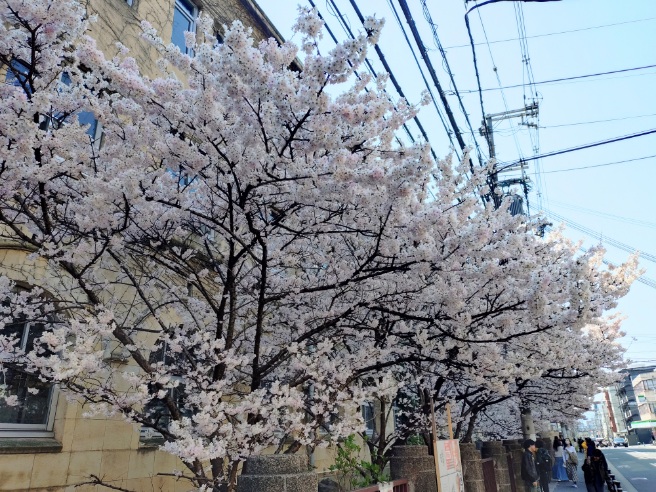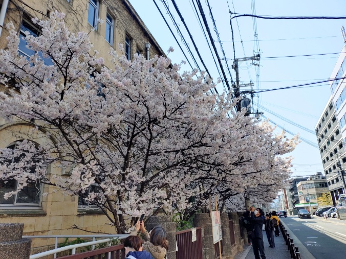その繁昌神社のほぼ正面には、元成徳中学校。こちらでは桜が満開です。早咲きの桜として人気スポットで多くの人で賑わっています。