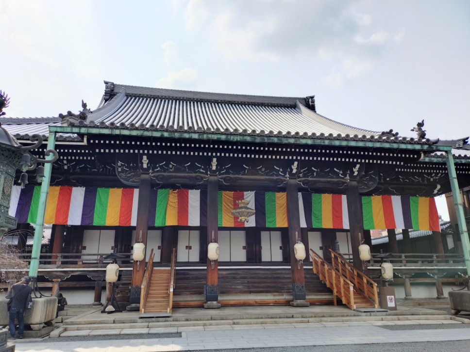 渡り廊下を歩いて隣の御影堂に戻ったら、五色幕と提灯が設置されていました。私が阿弥陀堂の中にいた間に取り付けられていました。予想せず景色が変わったので、少しびっくり!